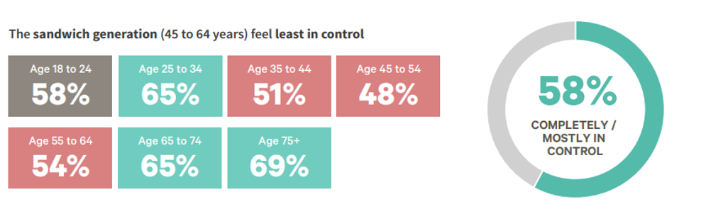 This pattern is especially pronounced for the ‘sandwich generation’ (ages 45-64), who are often balancing multiple demands at once, including peak responsibilities at work, caring for both children and ageing parents, and managing their own changing health and priorities¹.